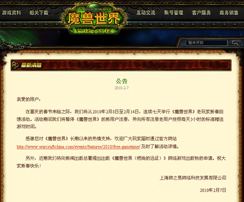 網易昨天是在一篇魔獸世界游戲內活動的公告中披露上述消息的。公告稱將從2010年2月8日至2月14日,連續(xù)七天舉行《魔獸世界》老玩家新春回饋活動;顒悠陂g將暫停《魔獸世界》的新用戶注冊,并向所有注冊老用戶按照每天3小時的標準贈送游戲時間。