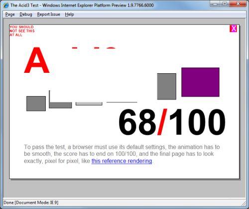 同時,微軟還提供了IE9第二預覽版的一些測試結(jié)果。在Acid 3測試中,新版瀏覽器得到了68分,高于首個版本。