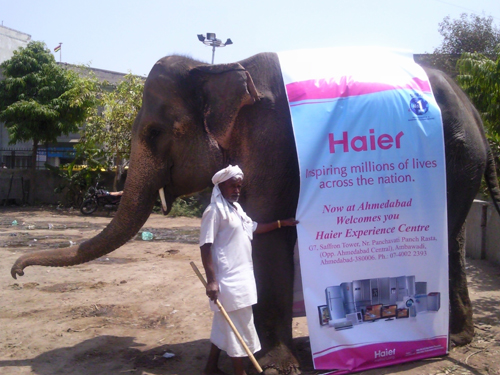 中新網(wǎng)4月8日電 在印度,大象是吉祥之物。日前,在印度著名的旅游城市艾哈邁達(dá)巴德的街頭,一頭背上馱著海爾宣傳畫的大象,氣宇軒昂地穿梭在繁華的街市,為新開業(yè)的海爾體驗店助威宣傳。這種宣傳方式別出心裁,吸引了很多印度消費(fèi)者來到海爾體驗店體驗海爾全系列高端差異化產(chǎn)品。