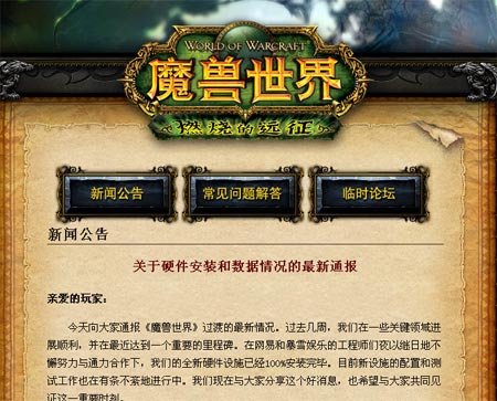 中新網(wǎng)6月24日電 今日,網(wǎng)易《魔獸世界》過渡網(wǎng)站發(fā)布最新通報,稱目前《魔獸世界》全新的硬件設(shè)施已經(jīng)100%安裝完畢。