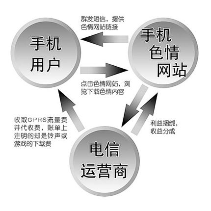“簡單來說,一條手機(jī)色情信息內(nèi)容的發(fā)布,一般要經(jīng)過三個環(huán)節(jié):運營商(主要是指各種手機(jī)圖片、鈴聲、視頻、文字、游戲等內(nèi)容發(fā)布平臺和渠道的提供者)、SP和WAP網(wǎng)站。”北京郵電大學(xué)一個曾長期關(guān)注移動增值業(yè)務(wù)的人透露,“SP在運營商和WAP網(wǎng)站間牽線搭橋,三者已形成捆綁各方的利益鏈,一旦獲利,三方都有收益!