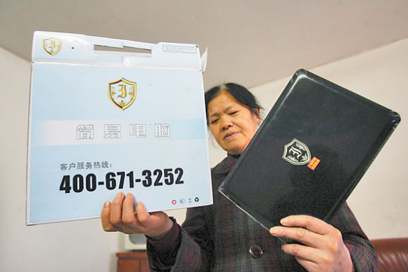 昨日,記者在大坪金銀街的湯大媽家里看到了這臺(tái)上網(wǎng)本。包裹上顯示的是由江蘇昆山市物流公司遞送的“10寸黑簡(jiǎn)易電腦+蘋(píng)果手機(jī)+DC”,沒(méi)有發(fā)貨的公司名稱,只留有電話號(hào)碼400-671-3252。這臺(tái)黑色的上網(wǎng)本是塑料外殼,很輕很薄,沒(méi)有產(chǎn)品名稱,外面蓋上有“簡(jiǎn)易電腦”幾個(gè)字,側(cè)邊有幾個(gè)USB 接口。