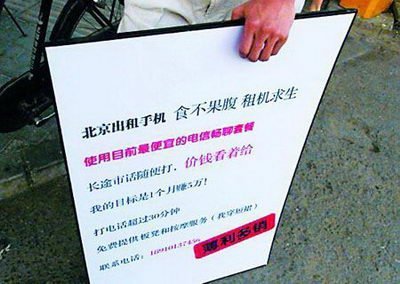 記者在論壇上看到,發(fā)帖的網(wǎng)友表示參照之前“強人”給她整理的手機賺錢指南,花費50元做了兩塊廣告牌便和妹妹一起出租手機開始創(chuàng)業(yè)。論壇帖子中還附帶了網(wǎng)友舉著廣告牌在北京的地鐵站做宣傳的圖片。廣告牌上寫著“北京出租收集,食不果腹,租機求生,使用目前最優(yōu)惠的套餐,長途市話隨便打,價錢看著給,我的目標(biāo)是1個月賺5萬!打電話超過30分鐘,免費提供板凳和按摩服務(wù)(我穿短裙)”。該名網(wǎng)友稱,“目前成本已經(jīng)掙回,滾滾大洋正在朝我們奔騰而來,大家還有什么高招趕快說”。昨日,記者曾嘗試撥打廣告牌上的聯(lián)系方式與該網(wǎng)友聯(lián)系,但被告知為空號。