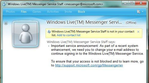 這個(gè)消息是從“messenger@”發(fā)出來的。然而,這個(gè)消息不是要發(fā)給昨天接收即時(shí)消息的用戶的。Windows Live Messenger團(tuán)隊(duì)已經(jīng)提醒用戶不要理會(huì)這個(gè)消息。