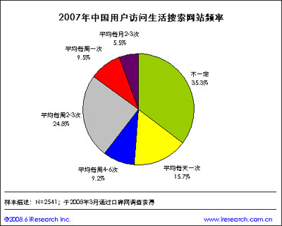 國家工業(yè)和信息化部公布的信息顯示,截至08年2月份,我國網(wǎng)民數(shù)達2.21億人,超過美國居全球首位。而截至2008年4月,國內(nèi)生活搜索覆蓋人群已經(jīng)超過1.03億,較去年同期增幅39%。在口碑網(wǎng)上完成的對網(wǎng)民調(diào)查顯示,約有59.2%的用戶每周至少訪問一次生活搜索網(wǎng)站,查找生活服務(wù)商家的信息或發(fā)布相關(guān)生活服務(wù)需求,其中將近24.9%的用戶幾乎每天都會訪問生活搜索網(wǎng)站,僅有不到4成的用戶沒有確定的訪問習(xí)慣。報告認為,正是基于用戶對于本地生活信息的需求促使生活搜索網(wǎng)站的出現(xiàn)。從目前訪問次數(shù)看,生活搜索網(wǎng)站已成為眾多網(wǎng)民日常生活比較依賴的工具之一。