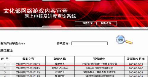 中新網(wǎng)7月21日電 今天,根據(jù)文化部網(wǎng)絡(luò)游戲查詢系統(tǒng)網(wǎng)站()上的信息顯示,由上海網(wǎng)之易網(wǎng)絡(luò)科技發(fā)展有限公司引進(jìn)的網(wǎng)絡(luò)游戲《魔獸世界》正式通過審批,批號為文網(wǎng)進(jìn)字[2009]006號,批文送發(fā)時間為2009年7月21日。