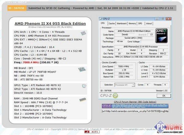 本周,由AMD特別提供的極品特供處理器Phenom II 42 TWKR在開(kāi)啟四顆核心的情況下,成功沖擊了7GHz大關(guān),創(chuàng)造了4核心處理器的最新世界記錄(默認(rèn)頻率:2.0GHz,超頻幅度達(dá)到250%)。
