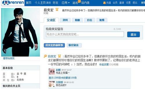 人人網(wǎng)明星主頁上的眾多明星們:光良、尚雯婕、游鴻明、段奕宏、王寶強(qiáng)等,還有世界小姐張梓琳和王靜瑤以及以那多為代表的新一代年輕作家都紛紛更新自己的狀態(tài)表示對(duì)恩師的問候,有的明星還在主頁上講述自己學(xué)生時(shí)代的趣事,而機(jī)構(gòu)主頁中的《環(huán)球時(shí)報(bào)》和光線傳媒《最佳現(xiàn)場(chǎng)》等也是在主頁上更新了教師節(jié)狀態(tài)以此表示對(duì)老師們的敬意。從電話、短信、電子郵件,表達(dá)祝福的方式在不斷演進(jìn),當(dāng)前社交網(wǎng)站因其基于真實(shí)用戶而產(chǎn)生的真實(shí)情感,成為人們表達(dá)祝福的最新選擇。