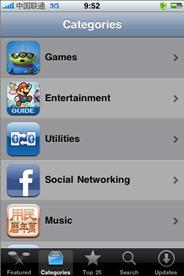 :展示App Store中軟件分類的列表。用戶可點擊列表中的某個分類查看該類別的所有軟件