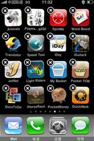 凡通過AppStore下載的軟件均可通過數(shù)步簡單操作完成刪除操作,以刪除“iDay”軟件為例說明刪除軟件的一般步驟:手指按壓“iDay”圖標(biāo),數(shù)秒鐘后圖標(biāo)將出現(xiàn)抖動狀態(tài),同時在圖標(biāo)左上方出現(xiàn)“ ”圖標(biāo),此時只需點擊“ ”即可完成刪除操作,如不再需要刪除軟件時,只需單擊“Home”鍵,圖標(biāo)即恢復(fù)到非抖動狀態(tài)。