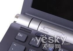 轉軸部分有一個STAMINA和SPEED模式切換鍵,這個切換鍵是專門針對這款機器獨特配置所設計的,由于Z55配備了雙顯卡,并且NVIDIA與IntelX4500并不支持熱切換,為了在省電和性能之間方便切換,索尼Z55加入了這個按鍵,在“持久(STAMINA)模式”中,它使用的是集成顯卡(移動式英特爾®圖形媒體加速器 4500MHD)。而在“(SPEED)模式”中,VAIO Z5系列使用的是獨立顯卡(NVIDIA GeForce 9300M GS (GPU) 顯卡,用戶可根據(jù)實際需求,在使用中做不同模式切換。