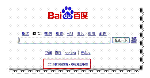 2月3日零點(diǎn),百度、去哪兒網(wǎng)聯(lián)合制作的“2010春節(jié)回家路•春運(yùn)完全手冊”專題上線發(fā)布,同時(shí)專題入口被放置在最引人注目的百度網(wǎng)站首頁。這是繼2009年“英特爾·影響明天的是誰?”專題后,百度2010年第一次啟用首頁資源的重大動(dòng)作。