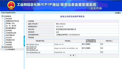 記者同時(shí)在工信部域名備案系統(tǒng)查詢發(fā)現(xiàn),相關(guān)域名已經(jīng)于2010年2月2日通過審核,申報(bào)單位為浙江阿里巴巴電子商務(wù)有限公司,且域名所匹配的ICP證號正是目前支付寶所使用的ICP證號。
