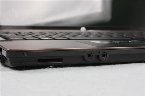 機身右側(cè),這里安置有電源適配器接口、DVD刻錄光驅(qū)和2個USB2.0接口,將USB/eSATA接口設(shè)計在近端雖然使插拔更加方便,但可能對鼠標操作有所限制,是一把雙刃劍。