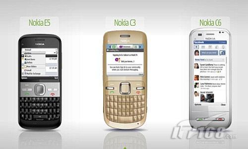 圖為諾基亞C3、諾基亞C6和諾基亞E5