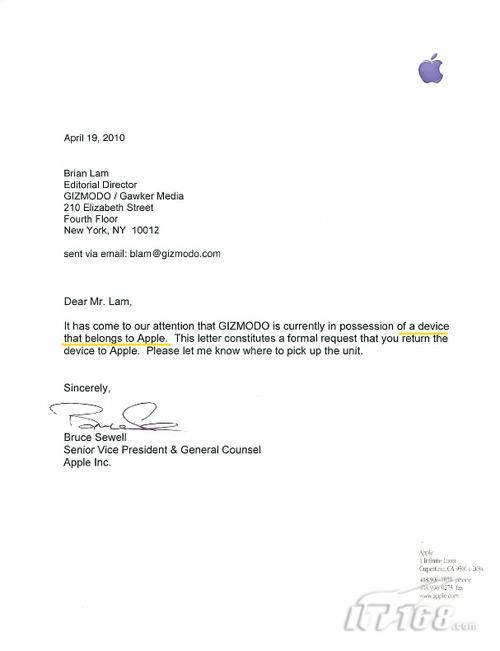 在與軟件工程師鮑威爾通過電話之后,蘋果公司首席法律顧問兼主管法律和政府事務的高級副總裁Bruce Sewell(此前是Intel的法律顧問)又給Gizmodo網(wǎng)站的編輯Brian Lam發(fā)送了一封電子郵件,信的內容是:Gizmodo網(wǎng)站拿到的那臺iPhone屬于蘋果公司,現(xiàn)正式要求你們將其歸還給蘋果,請告知取回的地址。