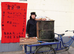 從“水冰月”所發(fā)的照片可以看到,賣紅薯者是一名年約30歲的男子,身穿深色皮襖,頭戴一頂雷峰帽,在一輛三輪車上放著一個由汽油桶改裝的烤爐。在烤爐上面,擺放著多個烤好的紅薯。另外,在其中的3個紅薯上面還分別插了牌子,分別寫著“和珅”、“秦檜”和“謝X龍”。