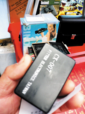 昨天上午,在某洋貨市場內(nèi)六區(qū)一家名為大帆世界精品屋門前的攤位上,一則廣告引起不少客人注目。只見廣告上赫然標(biāo)明銷售“手機竊聽器”。得知有人詢問竊聽器,這名南方口音、40多歲的攤主顯得很謹(jǐn)慎,不停打量著記者。經(jīng)過幾番交談,攤主看不出什么破綻,才小聲說道:“這東西不是隨便賣的,我就給你講講吧。只要你買任何一張手機卡插到里面,再將裝置放在你需要竊聽的地方。使用時,你只需要撥打裝置里的手機號碼,就可以聽到那個地方的聲音了。因為你使用的是手機竊聽,所以無論多遠(yuǎn)都可以,只要有信號就行。”