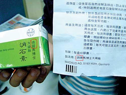17日上午,記者看到“消石素”的藥盒上寫(xiě)有“德國(guó)馬博士大藥廠”字樣,而說(shuō)明書(shū)上標(biāo)的制造商,卻是“西德馬博士大藥廠”。就是“德國(guó)”與“西德”這點(diǎn)差別,讓李先生對(duì)藥品的真實(shí)性產(chǎn)生了懷疑。李先生認(rèn)為,東德與西德早就統(tǒng)一,哪里既有德國(guó),又有西德呢?
