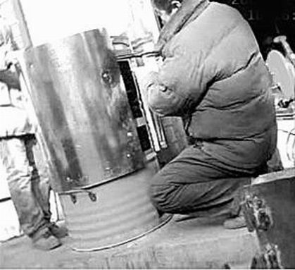 昨天(12月24日),記者來到天橋區(qū)臧家屯小區(qū)附近,一條街旁有幾家加工鐵爐子的業(yè)戶,其中一家業(yè)戶前擺著一些大鐵桶,業(yè)戶在一個(gè)藍(lán)色的大鐵桶前忙活著。記者走近一看,業(yè)戶在加工地瓜烤爐,他給藍(lán)色的大鐵桶包上半米高的白色鐵皮!澳氵@里加工地瓜烤爐嗎?多少錢一個(gè)?”記者問。“300多元一個(gè)!睒I(yè)戶指著正在加工的大鐵桶說,“這個(gè)烤爐已經(jīng)有人買了,你如果想要烤爐,先挑個(gè)鐵桶吧!