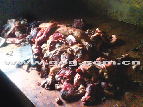記者昨日(1月13日)在現(xiàn)場看到,一間不大的瓦房內(nèi)掛滿了熏制好的臘肉,約有百余條,地上還有很多松枝燃燒后剩下的灰燼,此臘肉外觀的顏色和市場上所賣的正規(guī)臘肉差不多,但仔細(xì)辨認(rèn)會發(fā)現(xiàn)其還有很多豬毛沒有完全剃掉。緊挨著該加工房的是一間大一點的屋子,其為初加工房,剛走近該屋記者立刻聞到一股酸臭味,制作臘肉的原材料隨意的丟棄在水泥地上,而且部分豬肉已經(jīng)變色發(fā)臭。該屋里還擺放有幾個盆和大桶,里面存放的黑色液體估計是用來腌泡臘肉的醬汁。