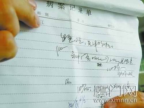 1日下午,在市內(nèi)某大醫(yī)院的兒科候診區(qū),記者隨手向一名帶孩子前來復(fù)診的家長(zhǎng)借了份病歷,一看就懵了:除了“09.2.1”的日期和表示藥物劑量的幾個(gè)阿拉伯?dāng)?shù)字能看清,其他字跡根本無法辨認(rèn)!搬t(yī)生寫字都是這樣。”這位家長(zhǎng)說,他從來就不去看病歷,看了也看不懂。