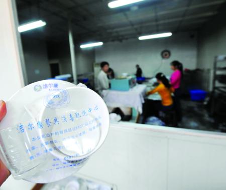 “這些餐具你們自己用不用?”面對(duì)工商執(zhí)法人員的詢問,一名正在清洗“消毒餐具”的女工沉默半晌后搖了搖頭,小聲地說:“我不用!27日中午,接到記者反映的情況后,工商部門查處了位于福州晉安區(qū)譚橋村的這家消毒餐具廠。記者看到,這家廠的餐具包裝袋上印著“潔爾康餐具消毒配送中心”字樣。