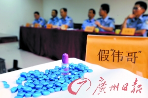昨日,記者在發(fā)布會(huì)現(xiàn)場(chǎng)看到了一箱箱被查獲的假冒“萬艾可”(俗稱偉哥),這些“偉哥”的外包裝精美,但將藍(lán)色的藥丸拿在手中,便發(fā)現(xiàn)質(zhì)量很差,藥衣很容易掉色。