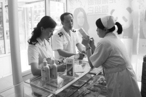 昨日10時許,記者與朝陽區(qū)衛(wèi)生局衛(wèi)生監(jiān)督所的執(zhí)法人員來到位于南湖大路一工地附近的瑞豐大藥房,這是一間規(guī)模較小的藥房,但藥房里擺放的藥品種類卻不少,據(jù)藥房內(nèi)的售藥人員介紹,店里的消毒藥主要賣給附近的農(nóng)民工。