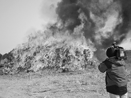 上午10:30左右,在經(jīng)過假劣藥械移交銷毀簽字儀式之后,點火開始。出席現(xiàn)場會議的相關(guān)領(lǐng)導(dǎo)首先點燃火把,引燃了浸透柴油的“藥山”。火苗躥起幾十米高,熊熊的火焰頓時吞噬了數(shù)以萬計的偽劣藥械。熱浪掀起的滾滾濃煙中不時傳來響亮爆炸之聲,不少灌裝液、氣體藥瓶被炸得飛上了天。