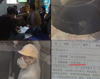 我們可以來(lái)看一下風(fēng)鉆爆破工人作業(yè)的圖片,這些鉆井和地面垂直,深達(dá)幾十米,工人在井底打炮眼,巖石粉塵四處飄散無(wú)法排出井口,環(huán)境十分惡劣。在彭飛平、程動(dòng)云等幾個(gè)工人接連死于塵肺病之后,跟他們一起打工桑植老鄉(xiāng)意識(shí)到了問(wèn)題嚴(yán)重,開(kāi)始尋求職業(yè)病鑒定。接下來(lái)發(fā)生了什么?