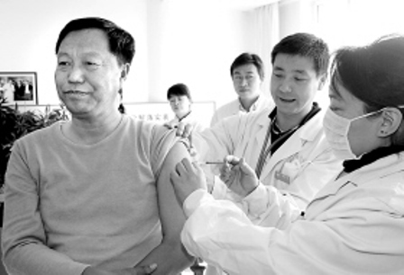 長(zhǎng)春市自10月20日開始接種甲型流感疫苗以來,國(guó)家撥給長(zhǎng)春市的13萬余人份疫苗只接種了72000余人份。第一批疫苗接種率不到60%,一個(gè)很重要的原因就是有的市民還心存顧慮。為了消除市民的顧慮,昨日上午,長(zhǎng)春市市長(zhǎng)崔杰等市領(lǐng)導(dǎo)接種了甲流疫苗,在場(chǎng)的媒體記者也進(jìn)行了接種。