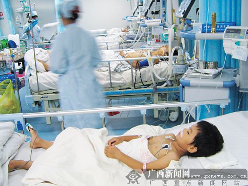 6月23日下午2時(shí),記者趕到貴港市人民醫(yī)院時(shí),正遇見(jiàn)自治區(qū)衛(wèi)生廳、教育廳的領(lǐng)導(dǎo)前來(lái)看望中毒的幼兒。在醫(yī)院外科樓二樓的重癥監(jiān)護(hù)室內(nèi),5名幼兒正在接受救治,其中3名病情較重。一名看起來(lái)只有四五歲的小孩口鼻插著導(dǎo)管,躺在床上不停地抽搐。醫(yī)生告訴記者,這名幼兒身體素質(zhì)較差,被送到醫(yī)院搶救后出現(xiàn)了血尿、高燒、肺水腫等癥狀,有病情加重的趨勢(shì)。后來(lái),經(jīng)過(guò)搶救,病情得到緩解。