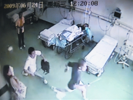 監(jiān)控錄像中顯示:一名光頭男子逃進搶救室,兩名男子持刀一路追砍(見圖),在搶救室一角將其砍成血人才罷休。行兇幾分鐘后,6名砍人兇徒從容走出醫(yī)院,沿香江花園路口向三眼橋方向逃走。傷者隨即被送進十一醫(yī)院手術(shù)室,搶救后一人傷勢嚴(yán)重被轉(zhuǎn)往協(xié)和醫(yī)院治療。