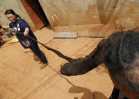 劉老太為什么要養(yǎng)這么多年的長(zhǎng)發(fā)呢?“邪!”老人說,10歲那年,她突然得了一種病,當(dāng)?shù)厝私泻畾獠 D谴尾×艘粋(gè)月,病好了,她的父母請(qǐng)當(dāng)?shù)匾粋(gè)算命先生給她算了算,先生說她只要留著長(zhǎng)發(fā)就不會(huì)生病了,當(dāng)時(shí)她還小不懂事,什么都聽父母的。從那時(shí)起,她就開始養(yǎng)長(zhǎng)發(fā)了。后來父母死了,但她相信算命先生的話,仍然堅(jiān)持著。
