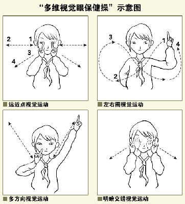 據(jù)介紹,“多維視覺(jué)眼保健操”時(shí)長(zhǎng)5分鐘,分“遠(yuǎn)近點(diǎn)視覺(jué)運(yùn)動(dòng)”、“左右圓線視覺(jué)運(yùn)動(dòng)”、“多方向視覺(jué)運(yùn)動(dòng)”、“明暗交替視覺(jué)運(yùn)動(dòng)”4節(jié)。做操時(shí),或雙手食指豎起,向前后上下左右方向伸出,或單手在眼前畫(huà)8字;眼睛始終盯著手指,隨著手指運(yùn)動(dòng)調(diào)整目光。