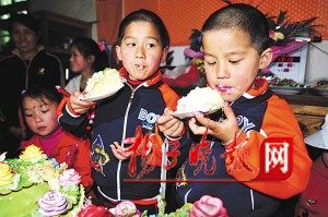踩過“步步糕”和“子孫蛋”后,儀式最重要的部分開始了。當(dāng)年的主刀醫(yī)生、南京市兒童醫(yī)院新生兒外科徐小群主任醫(yī)師和護(hù)士長夏娟各剪斷了一條尾巴,并送上了禮物——兩個書包。一下子見到那么多生人,兩個孩子似乎有點(diǎn)不太適應(yīng),連平日里一向活潑的蘇寧也變得沉默寡言起來。只有在吹完蠟燭吃蛋糕時,兩個孩子才放松下來,丟下手中的叉子直接啃起了蛋糕。