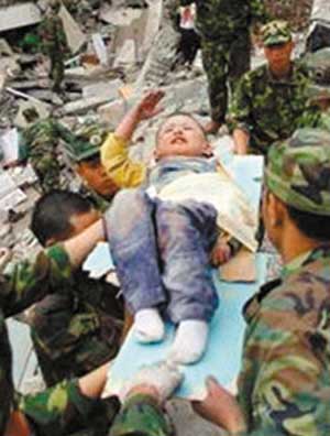 【當初】:在地震發(fā)生十余小時后,一位滿臉是血的男孩終于被武警官兵從廢墟中救出。男孩的左手骨折,一位戰(zhàn)士用木板小心地夾住他的手臂,纏上了繃帶,又慢慢地給男孩喂了一些礦泉水。把男孩放在一塊藍色的木板上后,武警官兵準備把他轉(zhuǎn)移到安全地帶,然而,就在這時,令人動容的一幕出現(xiàn)了:年幼的男孩艱難地舉起尚能動彈的右手,虛弱而又標準地敬了一個少先隊隊禮。