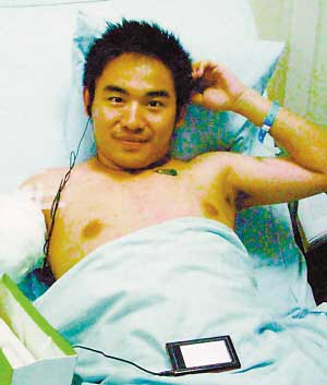 21日凌晨麻醉劑的藥效過(guò)去后,廖波疼痛難忍,為了不影響同室兩名病友休息,他咬著毛巾和筷子堅(jiān)持著,最后把一雙筷子都咬斷了也沒(méi)呻吟一聲。目前,他的病情已趨于穩(wěn)定,但可能還需要再次手術(shù)。住院期間,廖波還認(rèn)了一名志愿者做干媽!八龑(duì)我特別好,是第一個(gè)幫我擦身子、換衣服的人。”廖波喊出“媽”的時(shí)候,志愿者頓時(shí)泣不成聲,把廖波擁在了懷里。