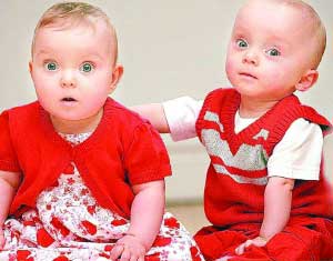 2007年5月,英國斯塔福德郡巴頓特倫特市一對夫婦生下了一對體重相差1倍的“奇跡雙胞胎”,當?shù)艿苷材匪埂烟厣聛頃r,體重竟然只有孿生姐姐哈麗特一半大!令人欣慰的是,13個月后,這對“大小雙胞胎”已長成了差不多同樣大小的健康嬰兒。
