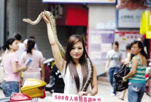 這名自稱叫“優(yōu)優(yōu)”的年輕女子說(shuō),她今年22歲,陜西人,曾是專業(yè)舞蹈演員。她從小不怕蛇,3年前自己養(yǎng)起了蛇,剛開始由于缺乏專業(yè)養(yǎng)殖知識(shí),死了好幾條蛇,她為此十分難過(guò),F(xiàn)在她對(duì)“蛇性”相當(dāng)了解,還學(xué)起了蛇舞、印度舞、肚皮舞。優(yōu)優(yōu)指指脖子上的蛇稱,這是條緬甸蟒,10多斤重,進(jìn)食胃口很大,不僅要吃豬肉,而且一次能吃七八只和鴿子差不多大小的鳥。由于養(yǎng)蛇,這幾年來(lái)優(yōu)優(yōu)一直單獨(dú)一人居住,“沒(méi)幾個(gè)人不怕蛇的,我只能帶著蛇單獨(dú)過(guò)!睅邅(lái)“逛”山西路,優(yōu)優(yōu)另有目的,她背后的胡導(dǎo)稱,他計(jì)劃花5年時(shí)間搜集500個(gè)奇人,拍攝奇人喜劇電影,讓他們展示各自絕技,目前有人愿出數(shù)百萬(wàn)拍攝。