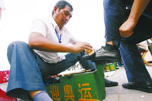 昨日下午,侯現(xiàn)中在水立方西門附近為游客免費擦鞋。本報記者 孫純霞 攝