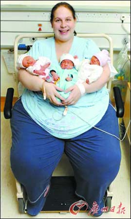 英國考文垂市體重達(dá)254公斤的產(chǎn)婦麗恩·索特近日成為全球最肥胖的三胞胎媽媽。她冒著極高的風(fēng)險,在68名醫(yī)務(wù)人員助陣下奇跡般地剖腹產(chǎn)下3個健康寶寶,并承諾為了照顧子女要減肥。