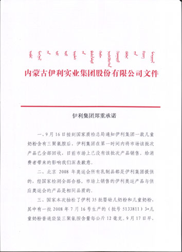 中新網(wǎng)9月17日電 伊利集團(tuán)今日發(fā)表聲明稱(chēng),16日在接到國(guó)家質(zhì)檢總局通知伊利集團(tuán)一款兒童奶粉含有三聚氰胺后,伊利集團(tuán)在第一時(shí)間內(nèi)將市場(chǎng)該批次產(chǎn)品已全部回收,目前市場(chǎng)上已沒(méi)有該批次產(chǎn)品銷(xiāo)售。同時(shí)為給消費(fèi)者帶來(lái)的影響深表歉意。