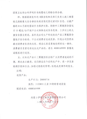 四、根據(jù)最新發(fā)布的《國(guó)務(wù)院相關(guān)部門(mén)負(fù)責(zé)人就三鹿嬰幼兒奶粉重大安全事故的有關(guān)情況答記者問(wèn)》信息,以最嚴(yán)格的0-6月齡的嬰幼作為保護(hù)對(duì)象,奶粉中三聚氰胺含量低于15毫克/公斤就不會(huì)對(duì)身體造成安全危害。三歲以上的兒童安全量會(huì)更高。雖然我公司生產(chǎn)的這批次產(chǎn)品三聚氰胺含量低于安全標(biāo)準(zhǔn),不會(huì)對(duì)消費(fèi)者造成危害,但我公司仍然本著對(duì)消費(fèi)者負(fù)責(zé)的態(tài)度,將會(huì)認(rèn)真妥善地處理好這一事件。消費(fèi)者手里若還有這批次產(chǎn)品的,請(qǐng)與4008169999客服電話聯(lián)系進(jìn)行退貨。