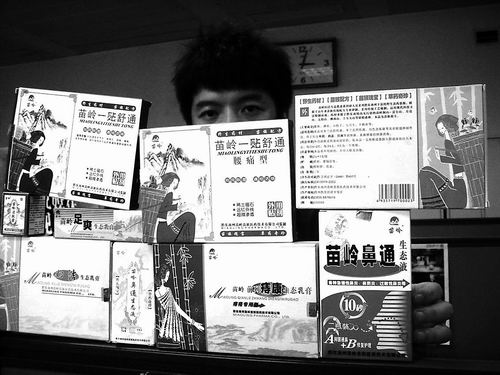 “我有鼻炎,常常鼻塞,有沒有什么好藥?”記者問!氨侨?”營業(yè)員從柜臺里面又取出一盒藥說,“你用苗嶺鼻通生態(tài)液吧,也是全中藥,效果特別好!