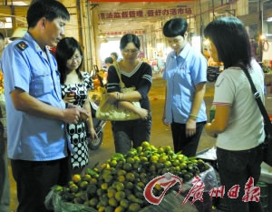 三水工商局在接到閔小姐情況反映后,立即派出工作人員及市場管理人員到該水果檔進(jìn)行調(diào)查,并由市場管理人員將該水果檔正在出售的一堆橘子拿到農(nóng)業(yè)部門送檢,等待檢驗(yàn)結(jié)果再作進(jìn)一步處理。