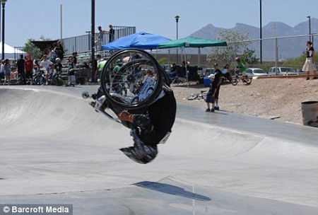 現(xiàn)年16歲的亞倫·佛斯靈漢姆(Aaron Fotheringham)被朋友們稱作“車輪” 。1991年11月出生在美國內(nèi)華達(dá)州的拉斯維加斯的他,患有脊柱分裂的先天疾病, 從3歲起就不得不依靠輪椅生活。但是,他卻成為了輪椅上完成后空翻高難度動(dòng)作的第一人(目前唯一的一個(gè)),他也因這一壯舉在2008年10月入選了吉尼斯世界紀(jì)錄。