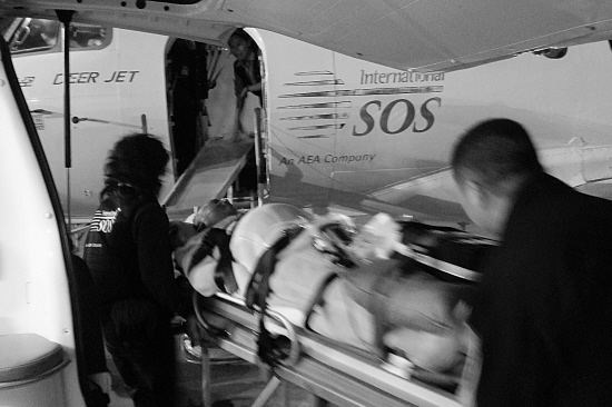 前天晚上7點10分,“SOS”(國際救援中心)的專機徐徐降落在溫州永強機場內,專機上迅速下來兩位醫(yī)護人員將大批醫(yī)療器械搬上了等候已久的120急救車上,隨即向溫州市區(qū)駛去……