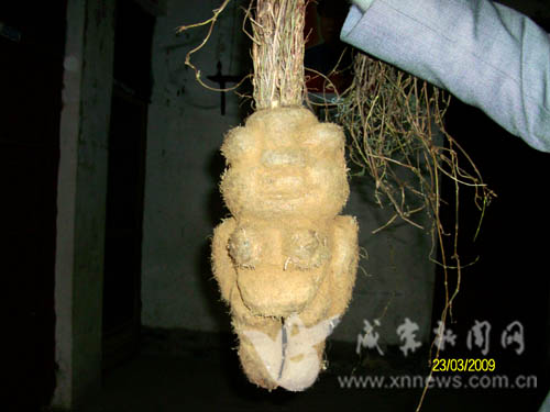3月21日,在通城縣北港鎮(zhèn)莊前村的杭瑞高速建設(shè)工地,施工時(shí)挖出一個(gè)特大的何首烏。何首烏長(zhǎng)相似一女性,雙眼突出,鼻口明顯,雙耳高聳,雙手雙腳如立正姿式,胸圍約40公分,身高35公分,重3600克。